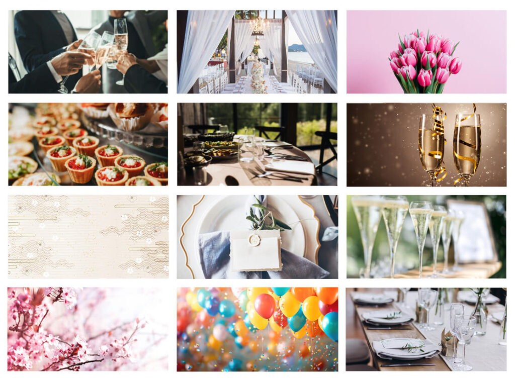 WEB招待状ヨブナラでは、無料で使用できる画像素材「ヨブナラフォト」が用意されています。花やお料理の写真、乾杯のシーン、和をイメージした絵柄など、幅広いテイストから選ぶことができます。