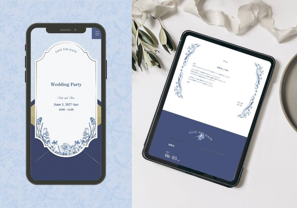 紙の招待状のような質感と繊細な線画イラストが特徴で、上品でクラシカルな印象に仕上がります。華やかさと落ち着きのバランスが絶妙で、幅広いスタイルの結婚式にマッチします。