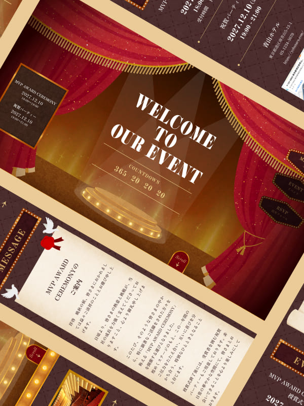 幕が開き、舞台にスポットライトが当たるオープニングアニメーションが印象的なテンプレート。