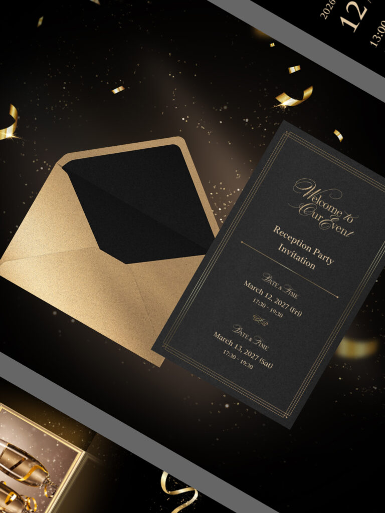 封筒アニメーションやリボン、スパークルなどの装飾がありながらも、落ち着いたトーンでまとめられているため、上品さを保ったまま特別感を演出できます。夜の結婚式や二次会におすすめです。