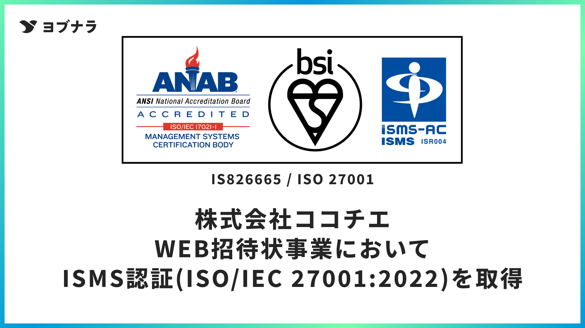 WEB招待状ヨブナラは、情報セキュリティマネジメントシステム(ISMS)の国際規格である「ISO/IEC 27001:2022」の認証を2025年9月25日付で取得いたしました。