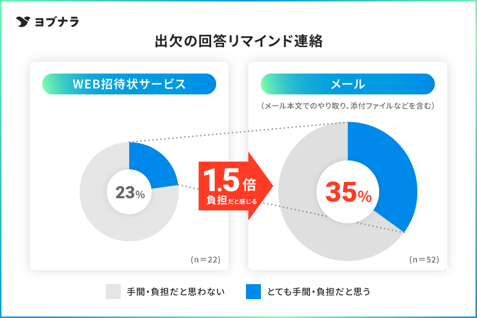 また、出欠の回答リマインドといった招待作業の工程でも、メールによる招待はWEB招待状の約1.5倍の手間・負担を感じることがわかりました。