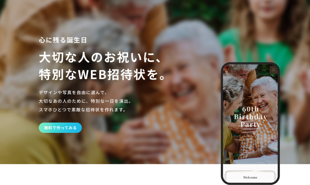還暦祝いや子供のパーティーなど、特別な日の招待状をスマホ一つで無料で作成できます