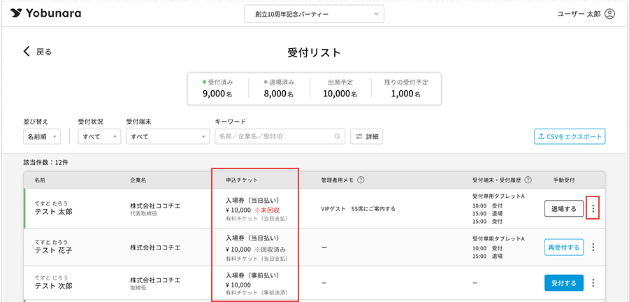 「当日支払いチケット」を設定している場合、受付リストでゲストごとの会費回収状況を管理できます。