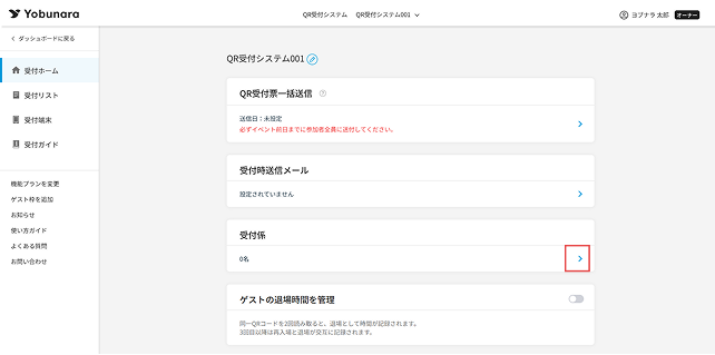 受付ホームの「受付係」セクションの[>(右矢印)」をクリックし、「受付係」ページにアクセスします。