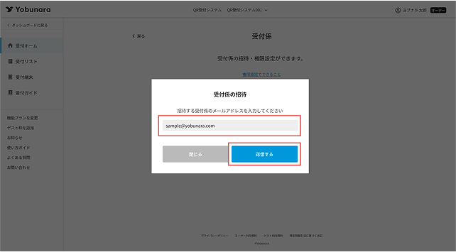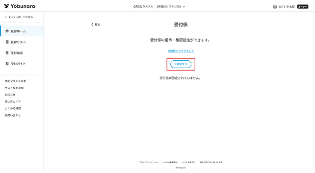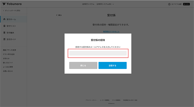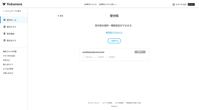 QR受付システムでは、「受付係」または「管理者」としてメンバーの追加ができます。