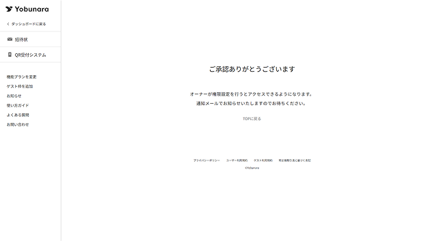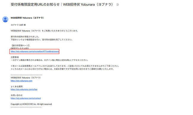 メンバーが招待メールから会員登録もしくはログインをすると、QR受付システムのオーナー宛に「受付係権限設定用URLのお知らせ|WEB招待状 Yobunara(ヨブナラ)」という件名のメールが届きます。