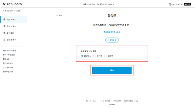 該当のメンバーに対して、「受付係」または「管理者」のいずれかの権限を選択し、[保存]ボタンをクリックしたら、受付係の設定完了です。メンバーには、受付係登録完了の通知メールが送信されます。
