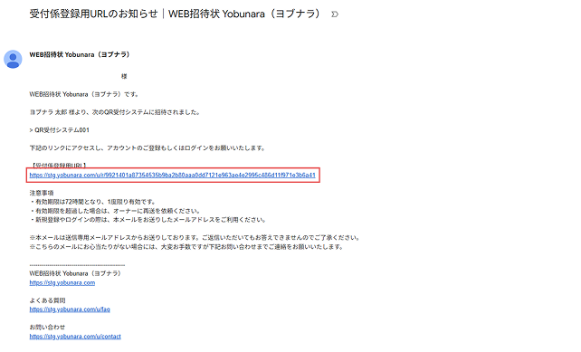 招待を受けた方には、「受付係登録用URLのお知らせ|WEB招待状 Yobunara(ヨブナラ)」という件名のメールが届きます。メール内のURLをクリックし、会員登録もしくはログインすると承認が完了します。