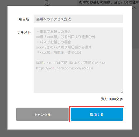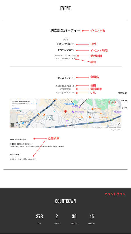 初期設定されている項目のほかに、会場へのアクセス方法や持ち物、ドレスコードなど、任意の項目を追加できます。