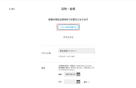①「日時・会場」の編集画面で、[イベント数を変更する]をクリック。