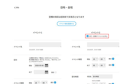 チェックを入れると、イベント2の日付・会場はイベント1と同じ内容が自動で設定され、招待状側では会場が重複して表示されないよう調整されます。