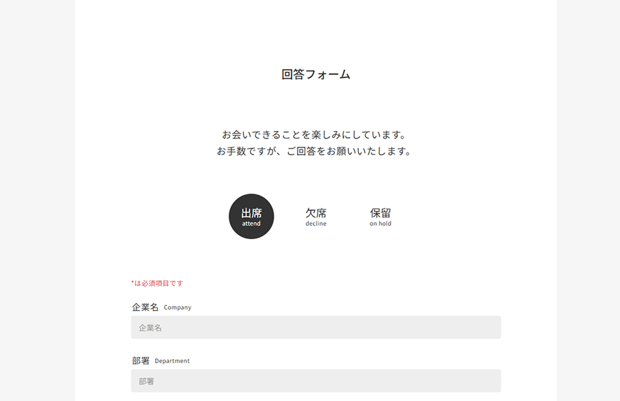 出欠回答フォームとは、ゲストが招待状を受け取り、出欠や必要情報を入力・送信するための入力画面です。