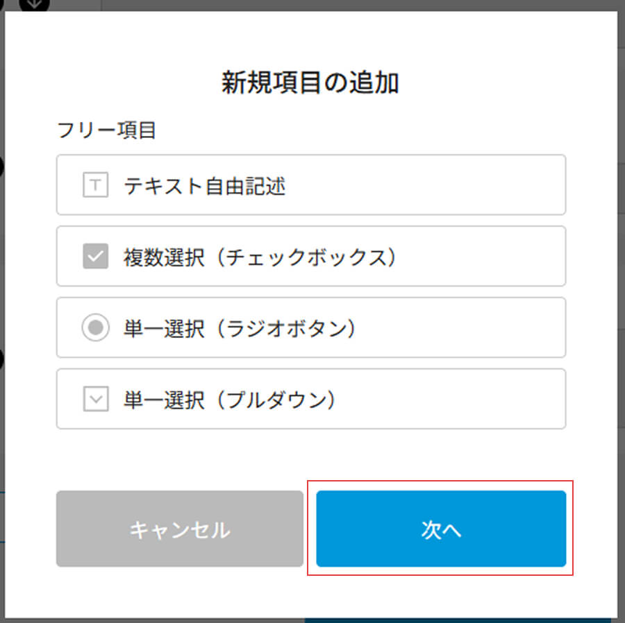 回答項目の「自由項目」として「選択式」を追加する手順を説明します。