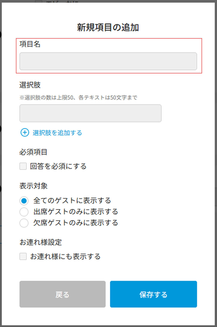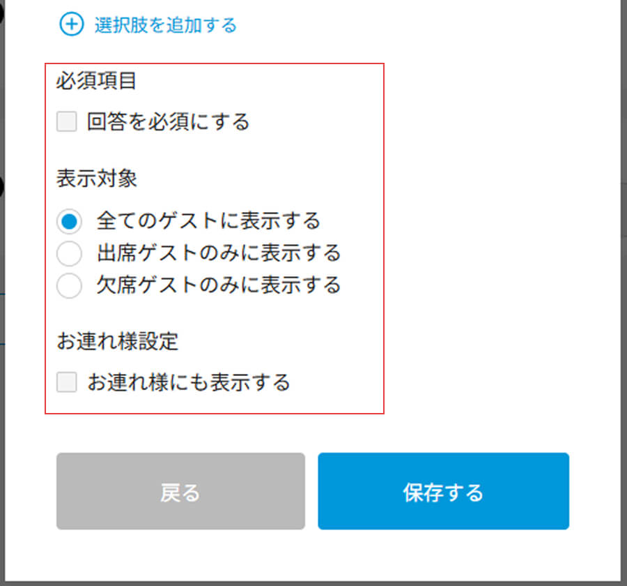 必須項目、表示対象、お連れ様設定などについて、それぞれ選択します。